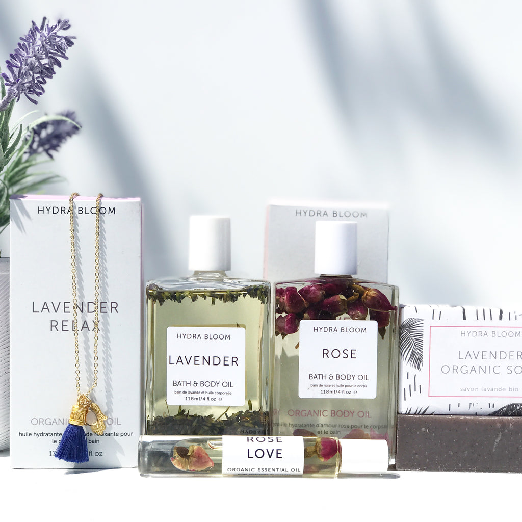 Hydra Bloom Lavender Body and Bath Oil, infused with organic lavender flowers, argan and sunflower Oils, lavender essential oils, and flower essences.